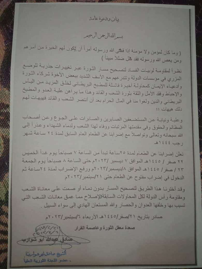 واعلن القيادي الحوثي صادق ابو شوارب، في بيانه عن عصيانه واضرابه عن الطعام، وذلك في بيانه الذي اصدره يوم امس الاول الأربعاء 6-- سبتمبر 2023.