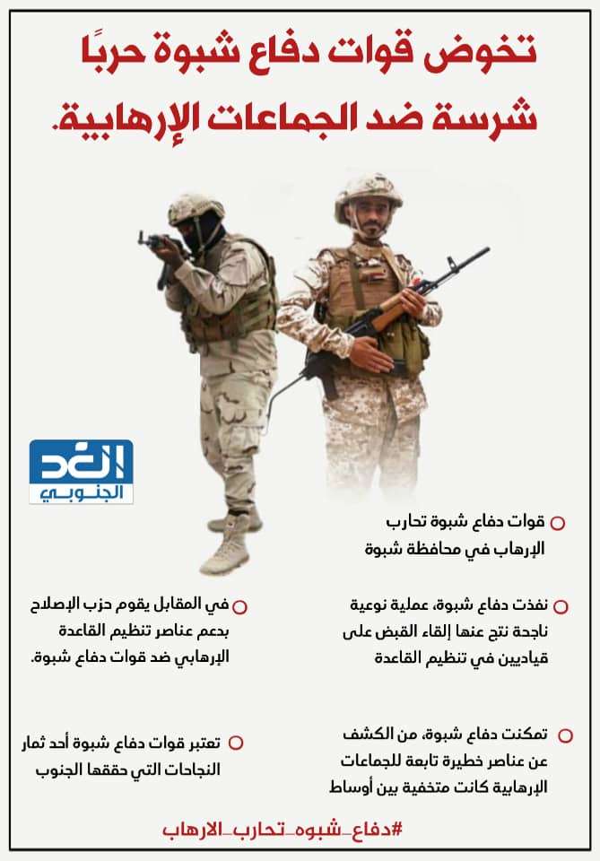 وأكدوا على أن: "قوات دفاع شبوة تخوض حربًا شرسة ضد الجماعات الإرهابية".