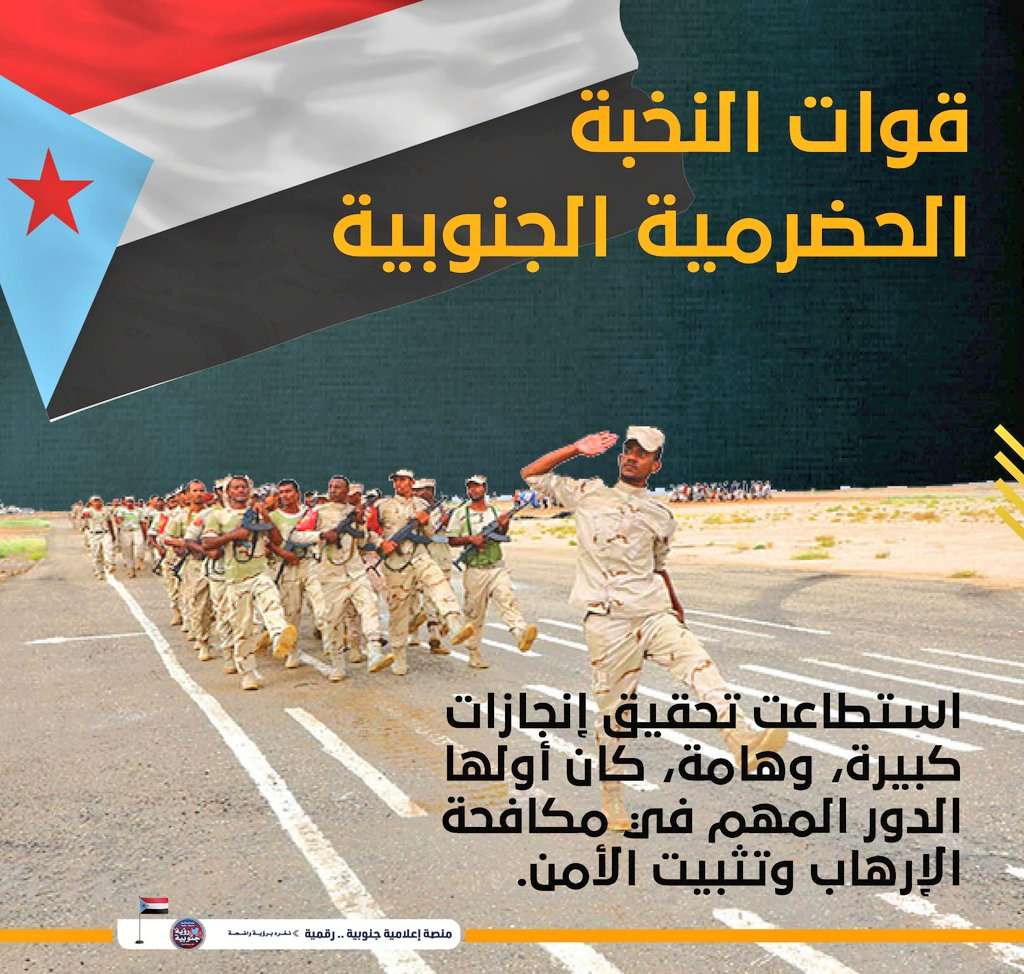النخبه قوة حضرموت ومصدر صلابتها ومناعتها والسور المنيع الذي تتحطم عليه كل المشاريع التآمرية على أمن واستقرار حضرموت ، وبالتالي فإن استهدافها المتواصل بالإشاعات المغرضة والحملات الإعلامية الزائفة، إنما محاولة لبعث الروح للإرهاب وتنظيماته وعناصره التي تم طردها من مدن ومناطق ساحل حضرموت على يد قوات النخبة الحضرمية ، وهي في المحصلة إستهداف لحضرموت وانسانها وأمنها واستقرارها وثرواتها وللجنوب بشكل عام ولقواته المسلحة الباسلة التي استطاعت ان تلحق الهزيمة تلو الهزيمة بالإرهاب وتنظيماته والقوى واليمنية المتخادمة معه عسكرياً واعلامياً.