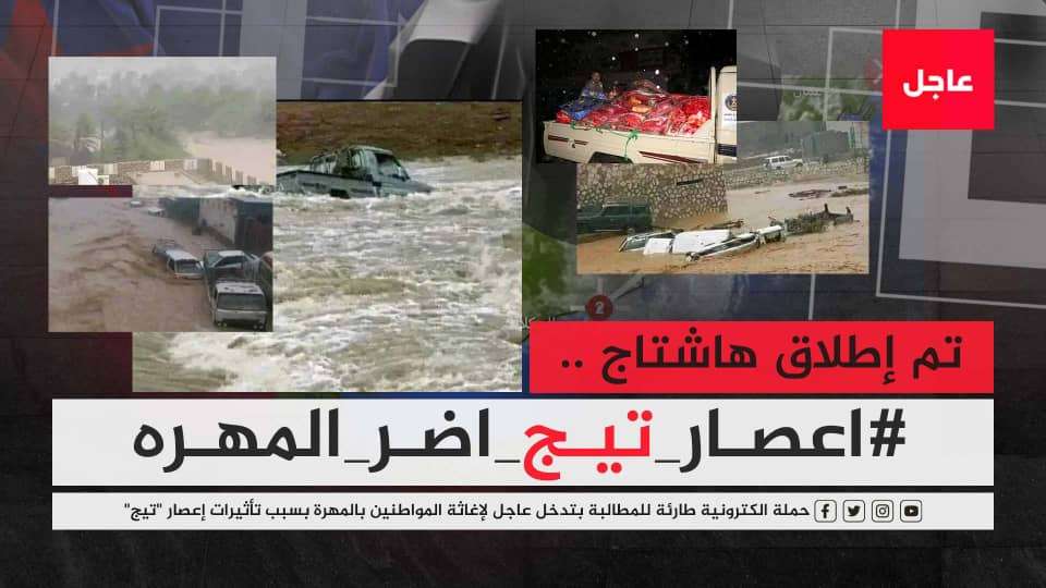 واطلق ناشطون وسياسيون جنوبيون عصر اليوم الثلاثاء 24 أكتوبر/تشرين الأول 2023م، هاشتاج #اعصار_تيج_اضر_المهره على مواقع التواصل الاجتماعي، اشهرها منصة X))، المعروفة سابقًا بـ(تويتر).