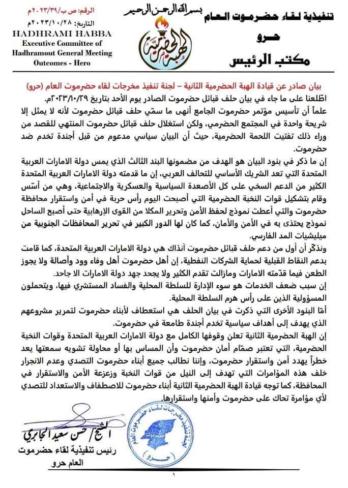 اطّلعنا على ما جاء في بيان حلف قبائل حضرموت الصادر يوم الأحد بتاريخ 29/10/2023م.