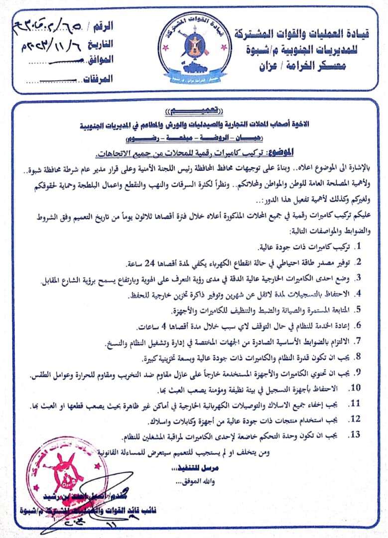 أصدرت قيادة العمليات والقوات المشتركة للمديريات الجنوبية بمحافظة شبوة” تعميما هاما لأصحاب المحلات التجارية والصيدليات والورش والمطاعم، في المديريات الجنوبية “حبان – الروضة – ميفعة – رضوم” بتركيب كاميرات مراقبة للحفاظ على الأمن والاستقرار.