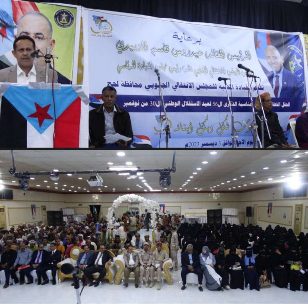 شهدت محافظة لحج صباح اليوم الأحد حفلا خطابيا وفنيا بمناسبة الذكرى الـ 56 لعيد الاستقلال الوطني 30 نوفمبر، نظمته القيادات المحلية للمجلس الانتقالي الجنوبي في المحافظة برعاية كريمة من الرئيس القائد عيدروس الزُبيدي، رئيس المجلس الانتقالي الجنوبي .