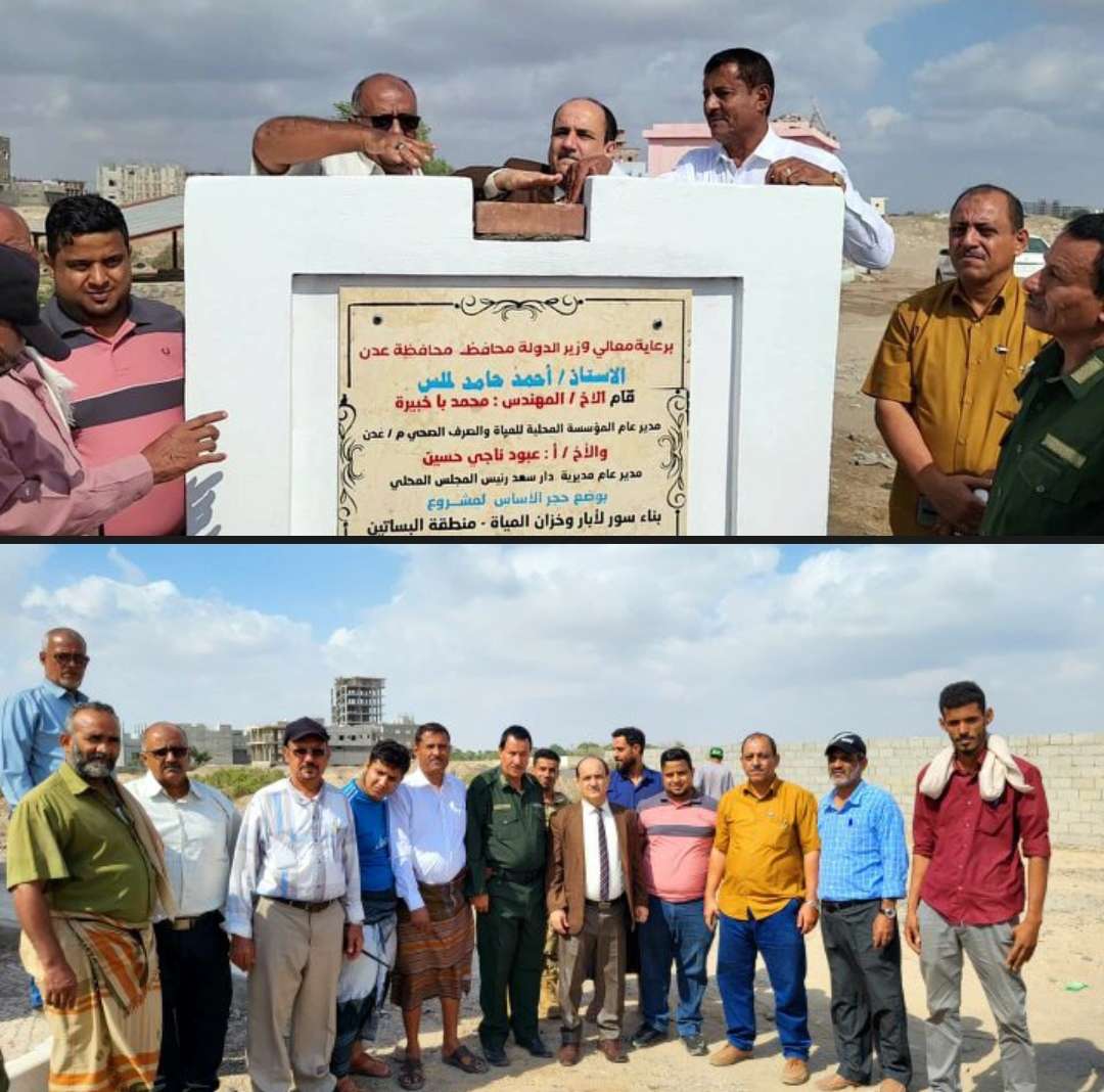 برعاية وزير الدولة محافظ العاصمة عدن الأستاذ أحمد حامد لملس _ وضع مدير عام مديرية دارسعد رئيس المجلس المحلي الاستاذ عبود ناجي حسين، صباح اليوم الأربعاء الموافق 13 ديسمبر 2023م ، حجر الأساس لمشروع بناء وتسوير ثلاثة مواقع آبار المياه مع ملحقاتها بمنطقة بئر فضل غرب المديرية وتسوير الخزان البرجي وعزلة عن مدرسة البساتين، بحضور المهندس كامل الحمامي ممثل عن المؤسسة العامة للمياه والصرف الصحي بالعاصمة عدن.