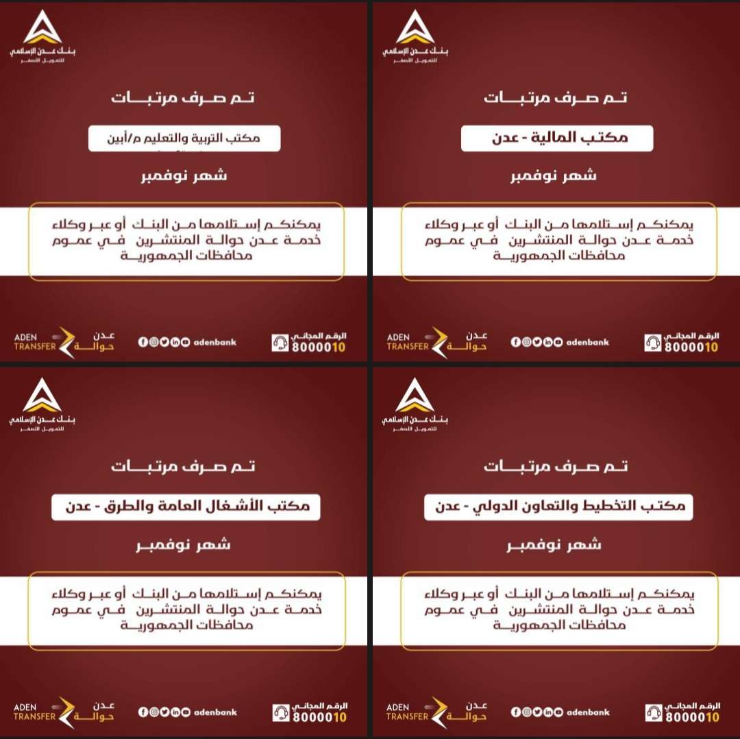 وكان بنك عدن الإسلامي للتمويل الأصغر، قد بدأ منذ بداية الشهر الجاري عملية صرف مرتبات المرافق الحكومية في عدد من المحافظات لشهر نوفمبر.