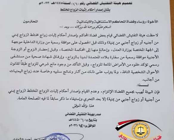 ويحد التعميم الموجه إلى رؤساء وقضاة المحاكم الاستئنافية والابتدائية من صلاحياتهم كسلطة قضائية “بسبب إصدارهم أحكام إثبات زواج مختلط (زواج يمني من أجنبية أو زواج أجنبي من يمنية) قبل الحصول على موافقة رسمية من وزارة داخلية المليشيات.