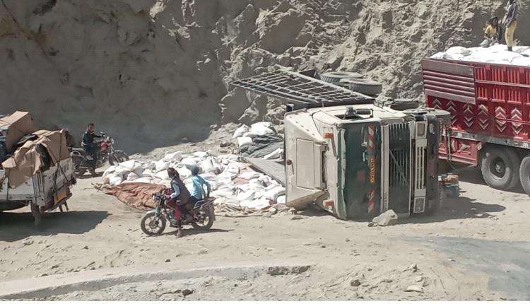 واكدت المصادر إن انقلاب الشاحنة جاء نتيجة تعثرها وعجزها عن مواصلة السير الأمر الذي أدى إلى انقلابها وسط الطريق الرئيسي البديل.