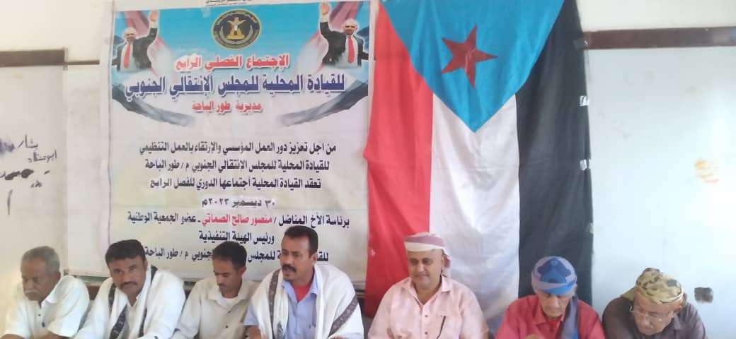 عقدت القيادة المحلية للمجلس الانتقالي الجنوبي بمديرية طورالباحه محافظة لحج اجتماعها الفصلي الاخير للعام الجاري صباح اليوم برئاسة رئيس المجلس الاخ منصورالصماتي وحضور نائب رئيس المجلس الشيخ محمدهواش احمد ومستشار المجلس الاستاذ منصورناصر ،
