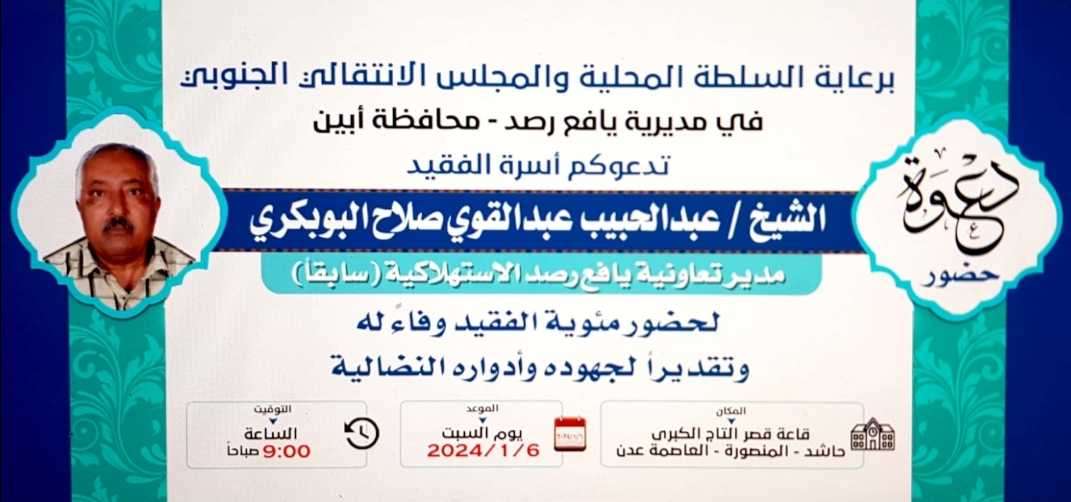 أعلنت أسرة الفقيد الشيخ "عبدالحبيب عبدالقوي صلاح البوبكري" عن موعد إقامة فعالية المئوية في العاصمة عدن.