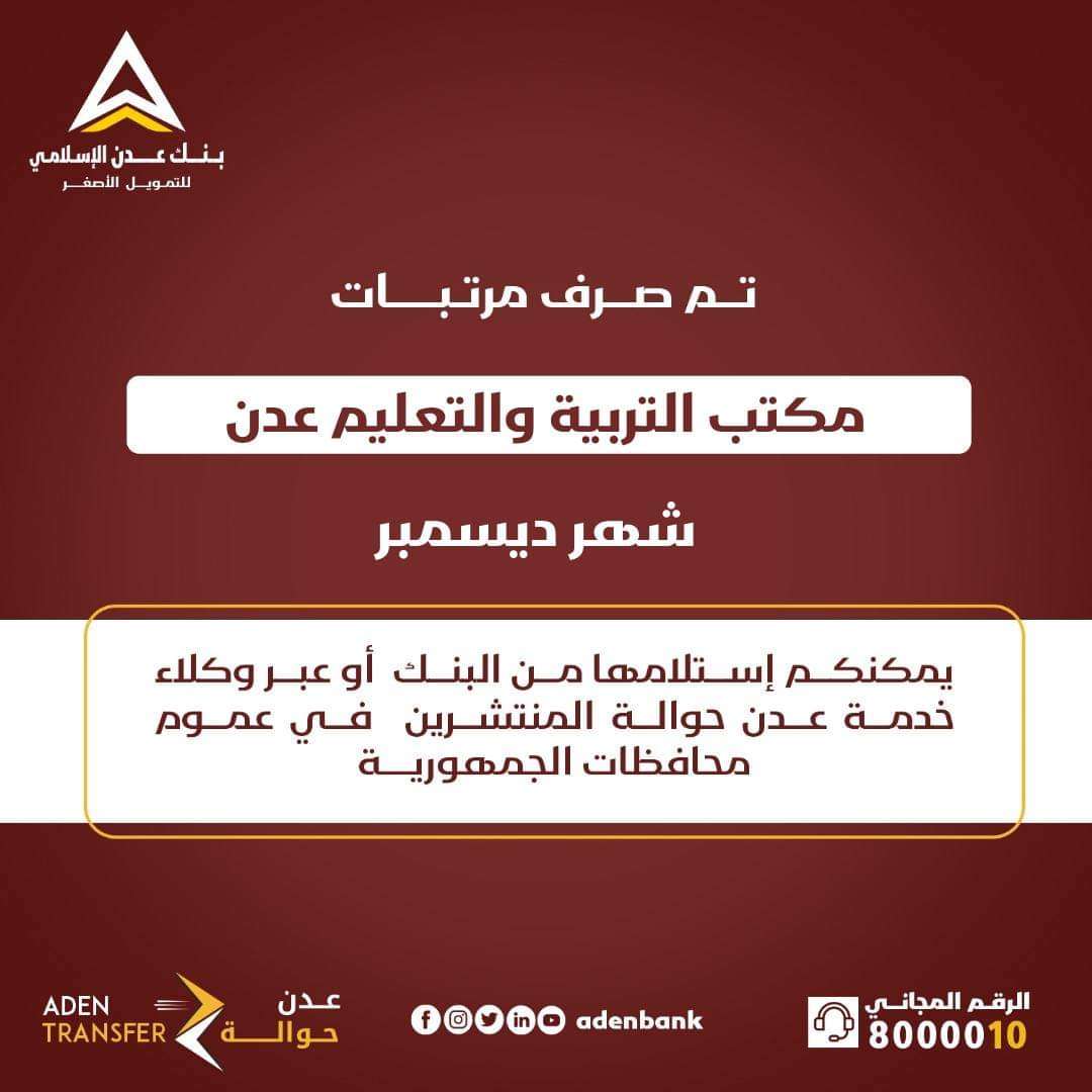 أعلن بنك عدن الإسلامي للتمويل الأصغر، اليوم الثلاثاء، بدء صرف مرتبات موظفي مكتب التربية والتعليم في العاصمة عدن، وذلك لشهر ديسمبر 2023م.