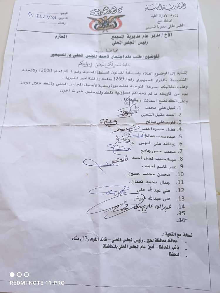 اعضاء المجلس المحلي بمديرية المسيمير بلحج يطالبون مديرها بعقد دورة عاجلة للمجلس