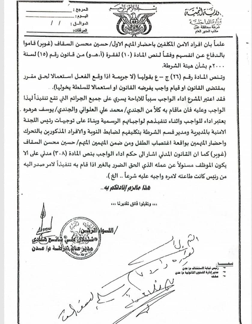 وبيّنت الوثيقة الرسمية، إنه جرى التحقيق مع "حسين السقاف، أثناء وجوده في مستشفى أطباء بلا حدود من قِبل رئيس البحث الجنائي ورئيس التحقيق بقسم شرطة المعلا وأخذ أقوله بخصوص قضية اغتصاب (طفل المعلا) لكونه أحد المتهمين فيها، وفقاً لأقوال الطفل الذي تعرض للاغتصاب ودعوى والده.