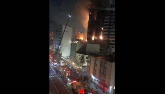 وطبقا لمقاطع فيديو، فإن الحريق يكاد يلتهم أحد جوانب المبنى.