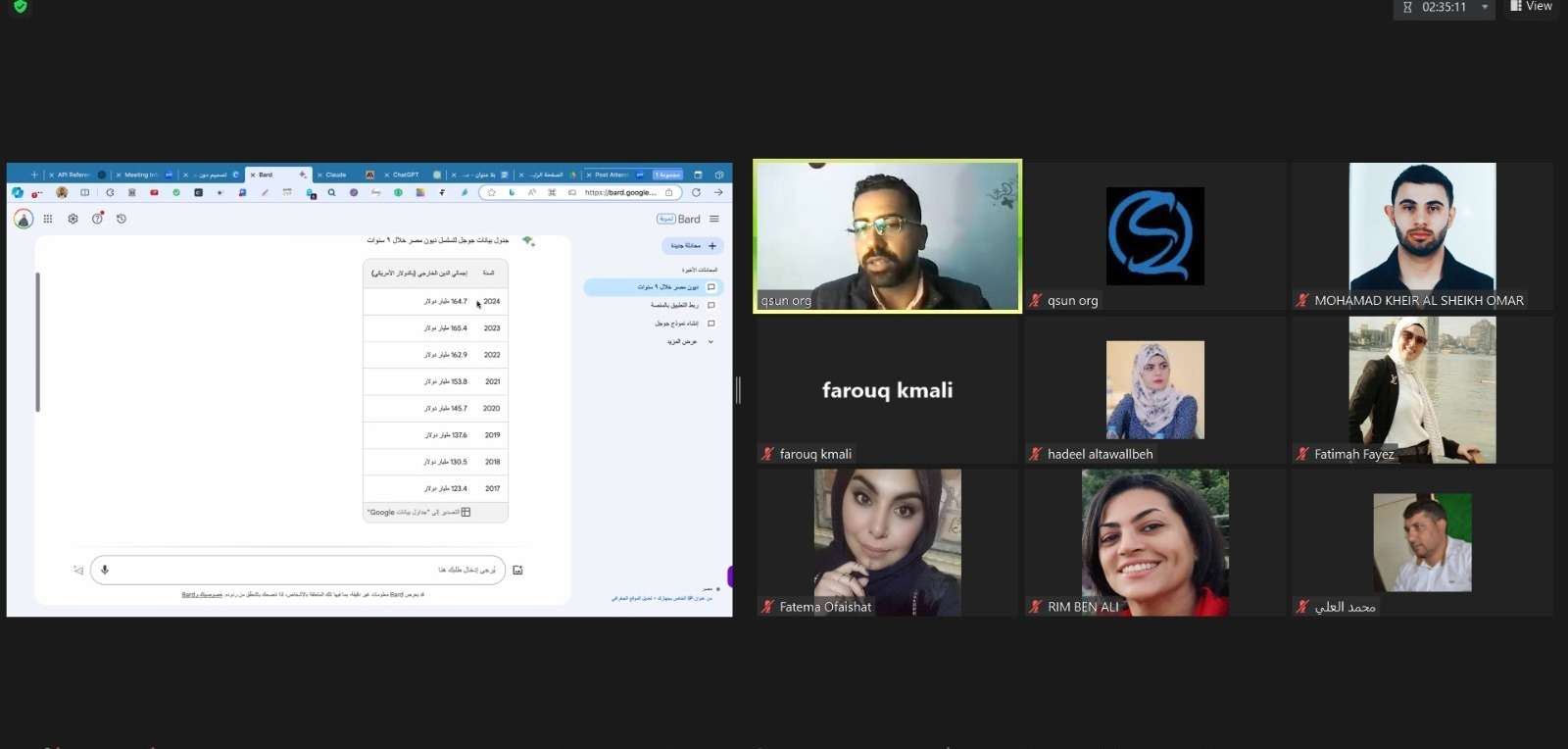 اقامت مؤسسة كيو سن للسلام والتنمية الإعلامية ومجموعة أوش لصناعات الذكاء الاصطناعي ورشة تدريبية افتراضية بعنوان "استخدامات الذكاء الاصطناعي في العروض التقديمية وشيتات ومستندات جوجل"، اليوم الجمعة 26 كانون الثاني 2024 استهدفت 20 صحفي وصحفية من المنطقة العربية، دربها وأدارها رئيس مجموعة أوش المهندس شحاته السيد مدير مجتمع مشروع ميتا للصحافة في الشرق الأوسط.