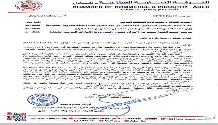 التوفيق. تود الغرفة التجارية والصناعية بعدن أن تطلعكم على ما يعانيه أشقاؤكم في اليمن من تردي مستمر للأوضاع المعيشية والاقتصادية الناتجة عن زيادة معدلات التضخم المتصاعد بنسب كبيرة في مقابل التدهور المستمر في أسعار العملة. إننا في الغرفة التجارية والصناعية إذ نتابع بحزن وألم كبيرين ما آلت اليه الأوضاع وما لحق