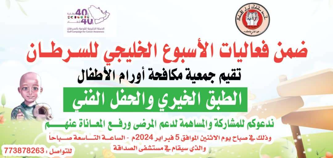 في إطار فعاليات الأسبوع الخليجي للسرطان، تُنظم جمعية مكافحة أورام الأطفال "الطبق الخيري والحفل الفني" لدعم مرضى السرطان ورفع المعاناة عنهم، وذلك في مستشفى الصداقة بالعاصمة عدن.