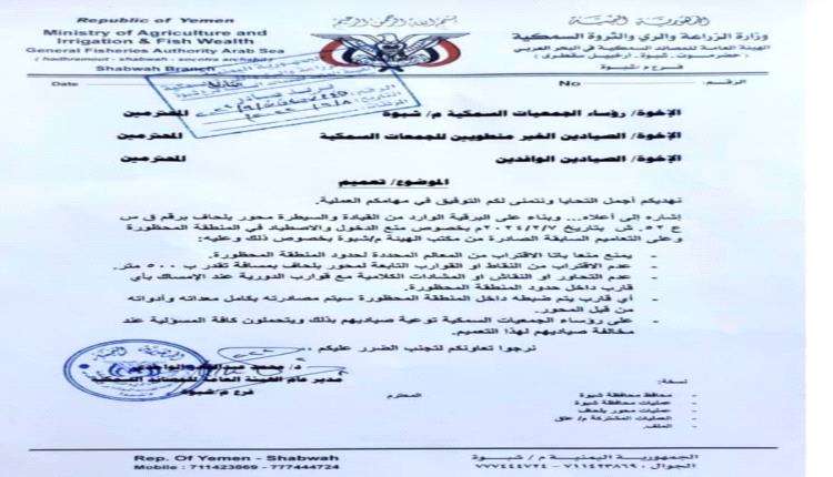 اصدر مدير الهيئة العامة للمصائد السمكية بشبوة يصدر بمنع الاقتراب من المنطقة المحظورة بناء على برقية من قيادة محور بلحاف.
