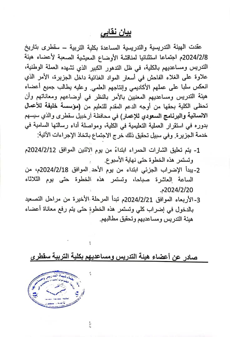اعضاء هيئة التدريس بكلية التربية سقطرى يعلنون عن تصعيد للمطالبة بتحسين أوضاعهم