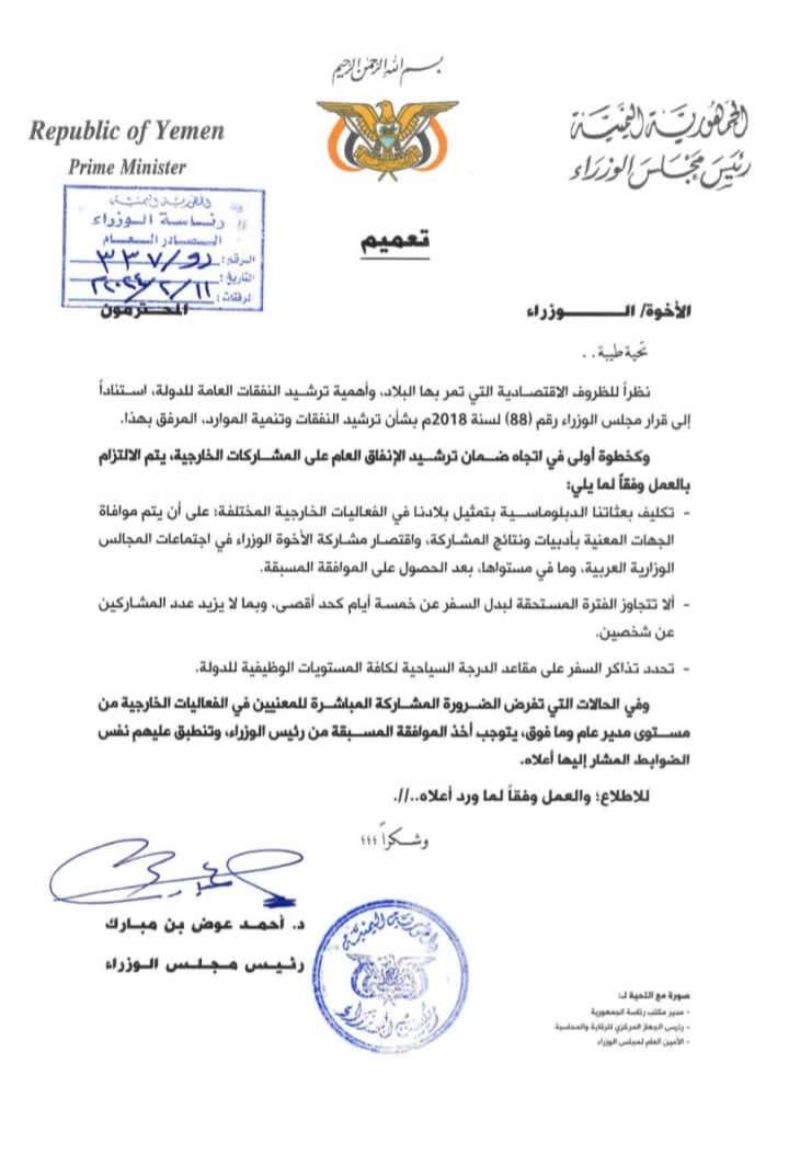 ويأتي هذه الخطوة "نظراً للظروف الاقتصادية التي تمر بها البلاد، وأهمية ترشيد النفقات العامة للدولة، استناداً إلى قرار مجلس الوزراء رقم (88) لسنة 2018م بشأن ترشيد النفقات وتنمية الموارد المرفق بهذا".