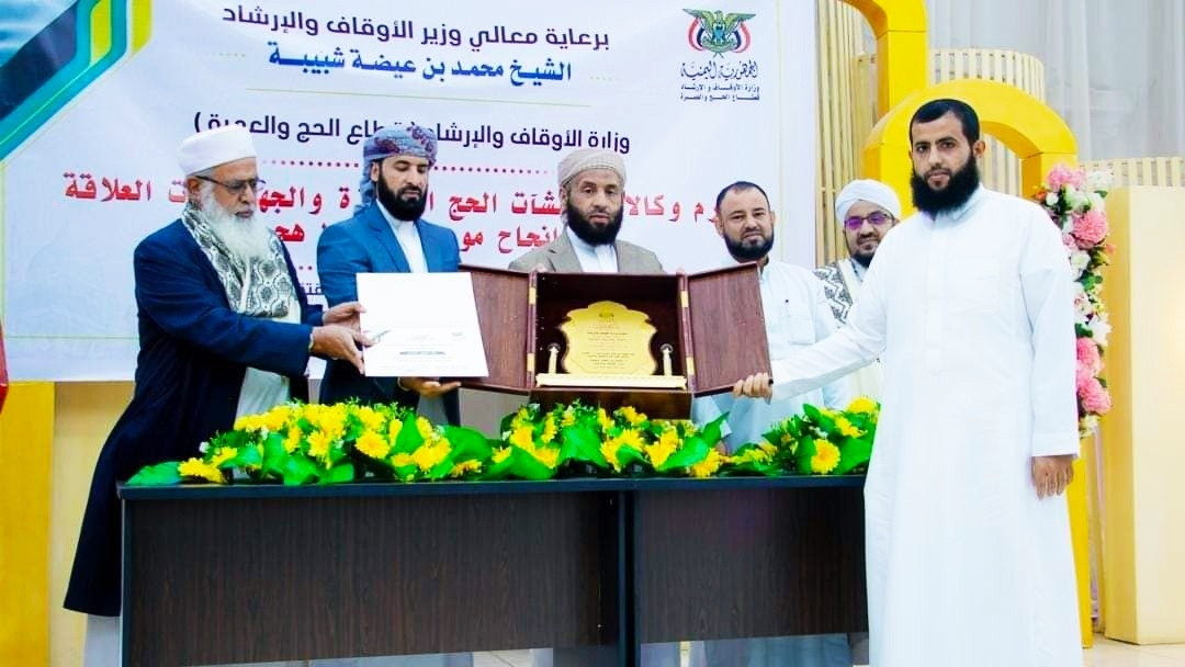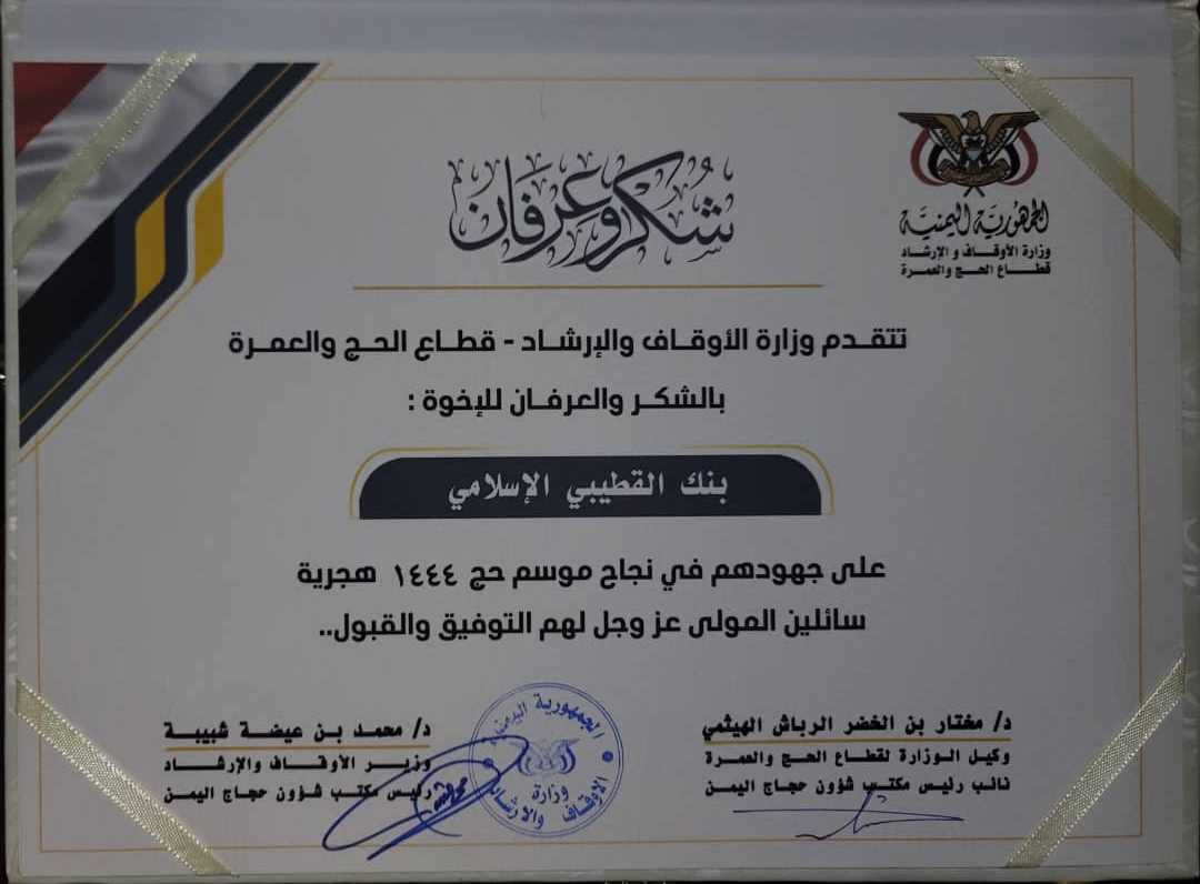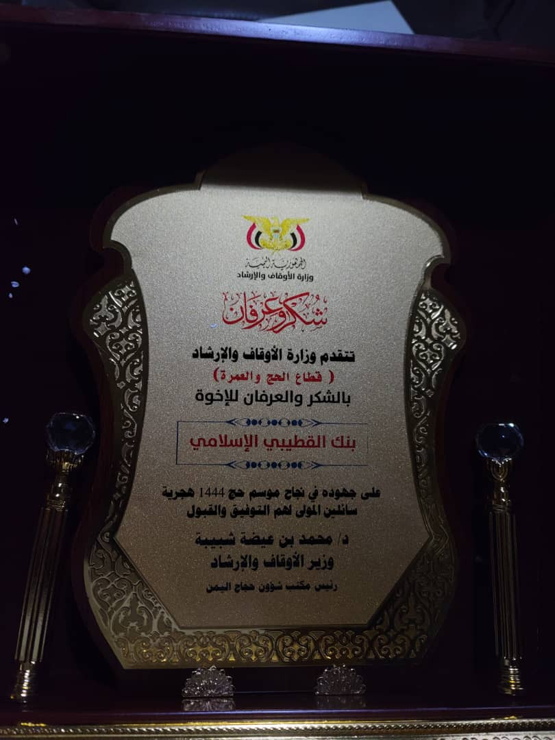 وقدم معالي وزير الأوقاف والإرشاد فيضلة الشيخ محمد بن عيضة شبيبة، رئيس مكتب شؤون حجاج اليمن درع تكريمي لبنك القطيبي الإسلامي تسلمه منه الأستاذ محمد القطيبي، نائب الرئيس التنفيذي للبنك.