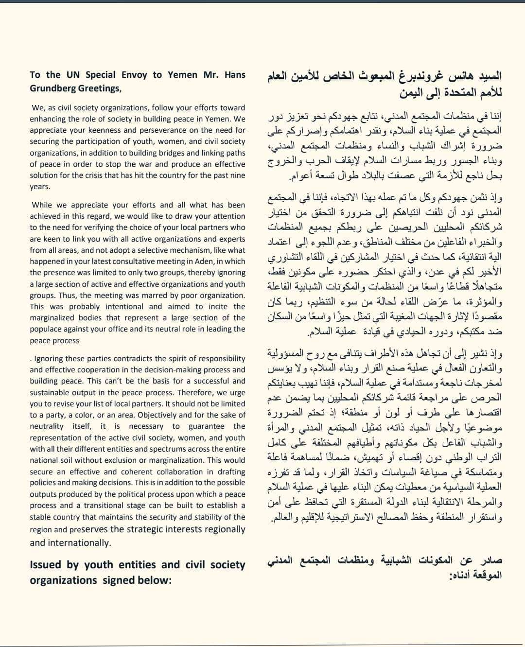 وإذ نثمن جهودكم وكل ما تم عمله بهذا الاتجاه، فإننا في المجتمع المدني نود أن نلفت انتباهكم إلى ضرورة التحقق من اختيار شركاتكم المحليين الحريصين على ربطكم بجميع المنظمات والخبراء الفاعلين من مختلف المناطق، وعدم اللجوء إلى اعتماد آلية انتقائية، كما حدث في اختيار المشاركين في اللقاء التشاوري الأخير لكم في عدن، والذي احتكر حضوره على مكونين فقط متجاهلا قطاعا واسعا من المنظمات والمكونات الشبابية الفاعلة والمؤثرة، ما عرض اللقاء لحالة من سوء التنظيم، ربما كان مقصودا لإثارة الجهات المغيبة التي تمثل حيرا واسعا من السكان ضد مكتبكم، ودوره الحيادي في قيادة عملية السلام.