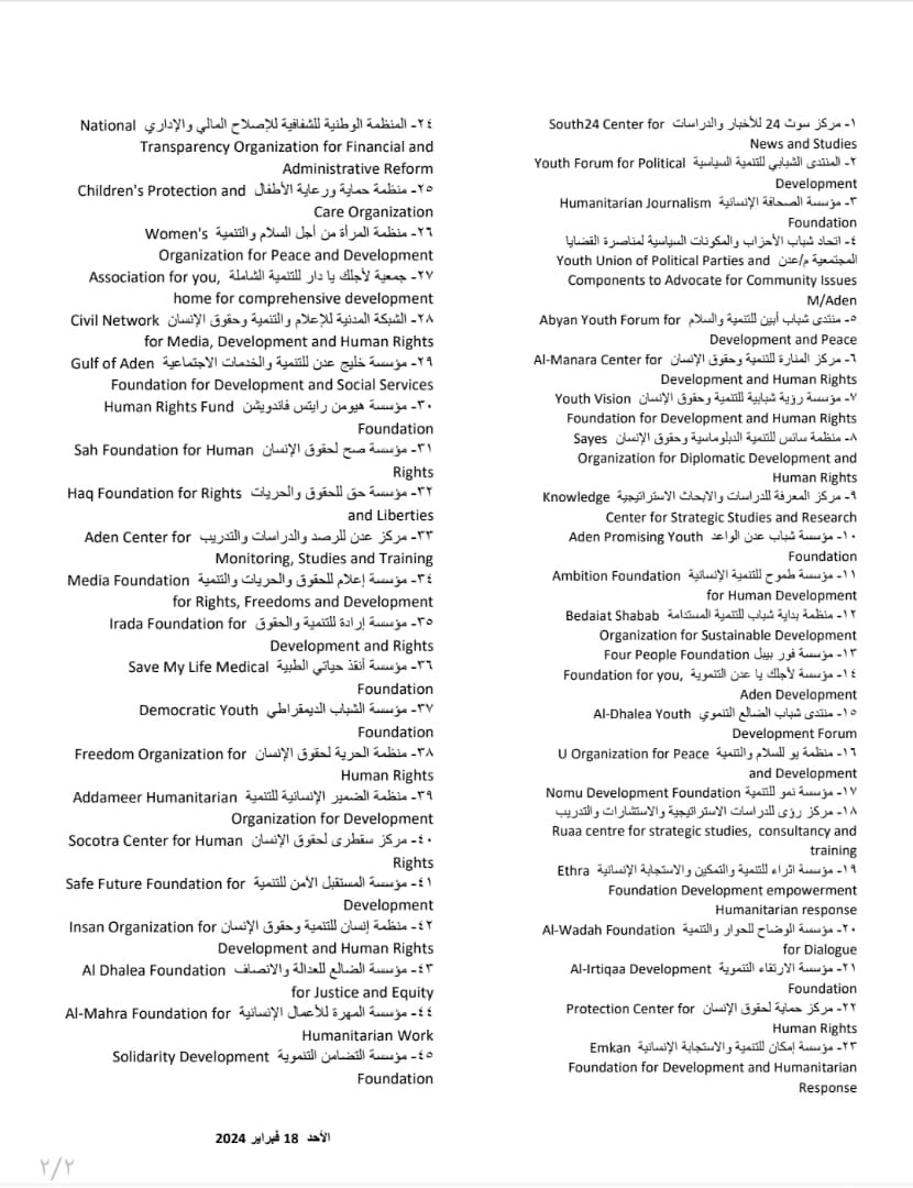 بيان مشترك لـ45 منظمة مدنية ومراكز دراسات في جنوب اليمن، يستنكر الإقصاء من أنشطة مكتب المبعوث الأممي غروندبرغ