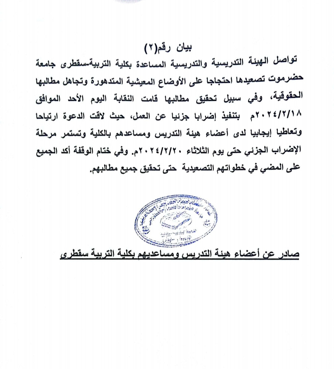 هيئة التدريس بكلية التربية سقطرى تعلن بدء إضراب جزئي للمطالبة بتحسين أوضاع منتسبيها