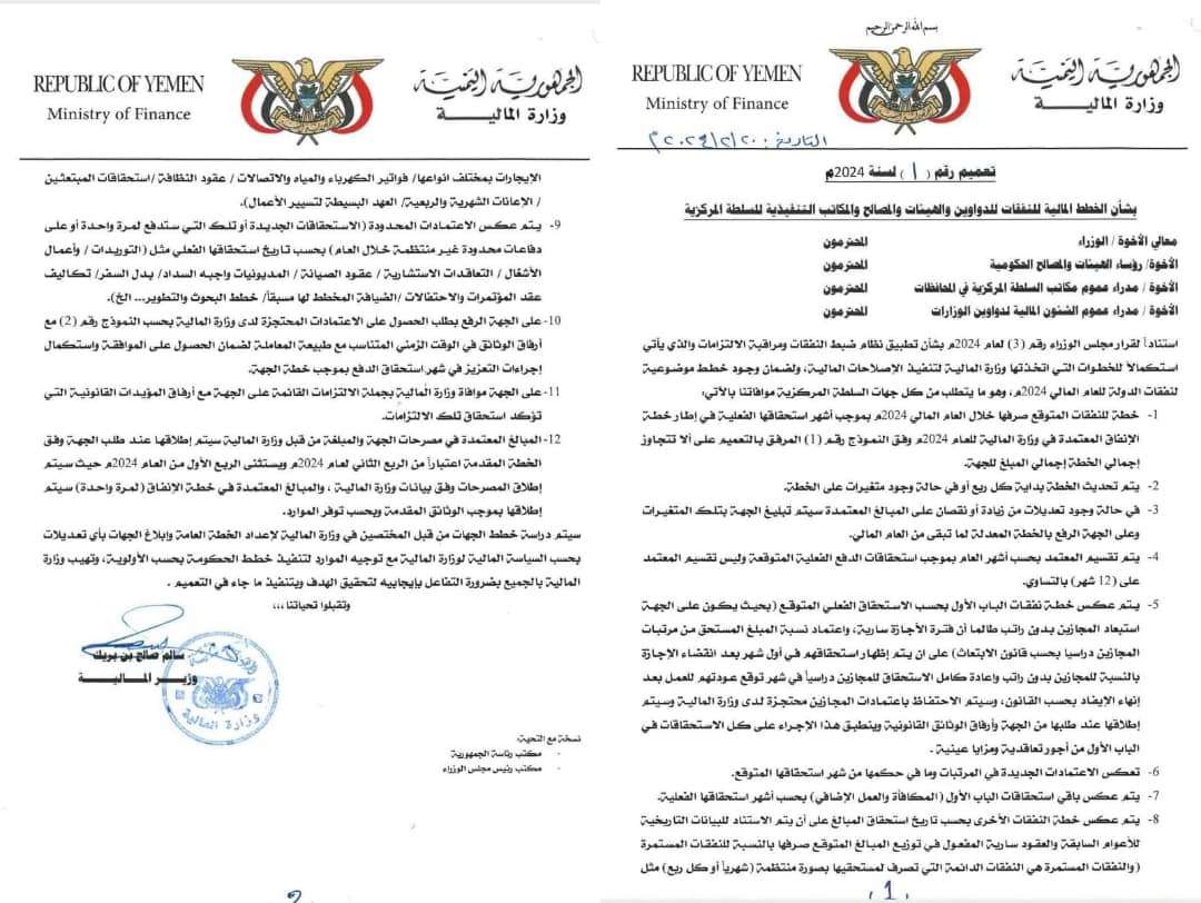 وجاء في التعميم: استنادا لقرار مجلس الوزراء رقم (3) لعام 2004م بشأن تطبيق نظام ضبط النفقات ومراقبة الالتزامات والذي يأتي استكمالا للخطوات التي اتخذتها وزارة المالية لتنفيذ الإصلاحات المالية، ولضمان وجود خطط موضوعية لنفقات الدولة للعام المالي 2024م، وهو ما يتطلب من كل جهات السلطة المركزية موافاتنا بالآتي: