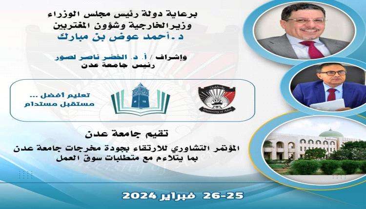 ويُقام المؤتمر التشاوري برعاية دولة رئيس مجلس الوزراء وزير الخارجية وشؤون المغتربين، الدكتور أحمد عوض بن مُبارك، وإشراف معالي الأستاذ الدكتور، الخضر ناصر لصور، رئيس جامعة عدن الذي يولي المؤتمر اهتمامًا كبيرًا بهدف الخروج بتوصيات تُسهم في تحسين جودة مخرجات جامعة عدن بما يتلاءم مع متطلبات سوق العمل.
