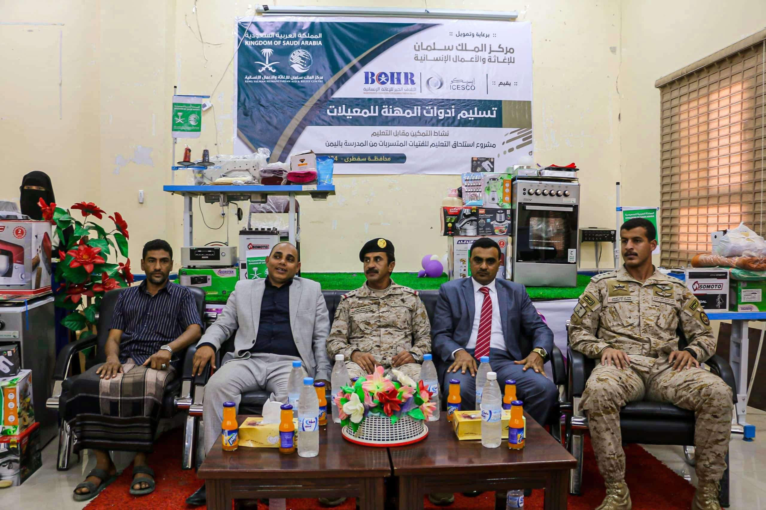 سلّم مركز الملك سلمان للإغاثة والأعمال الإنسانية أمس الاثنين في محافظة أرخبيل سقطرى أدوات المهنة لمعيلات الأسر المستفيدات من نشاط " التمكين مقابل التعليم" ضمن مشروع استلحاق الفتيات المتسربات من التعليم في اليمن الذي ينفذه ائتلاف الخير للإغاثة بالشراكة مع منظمة الإيسيسكو.