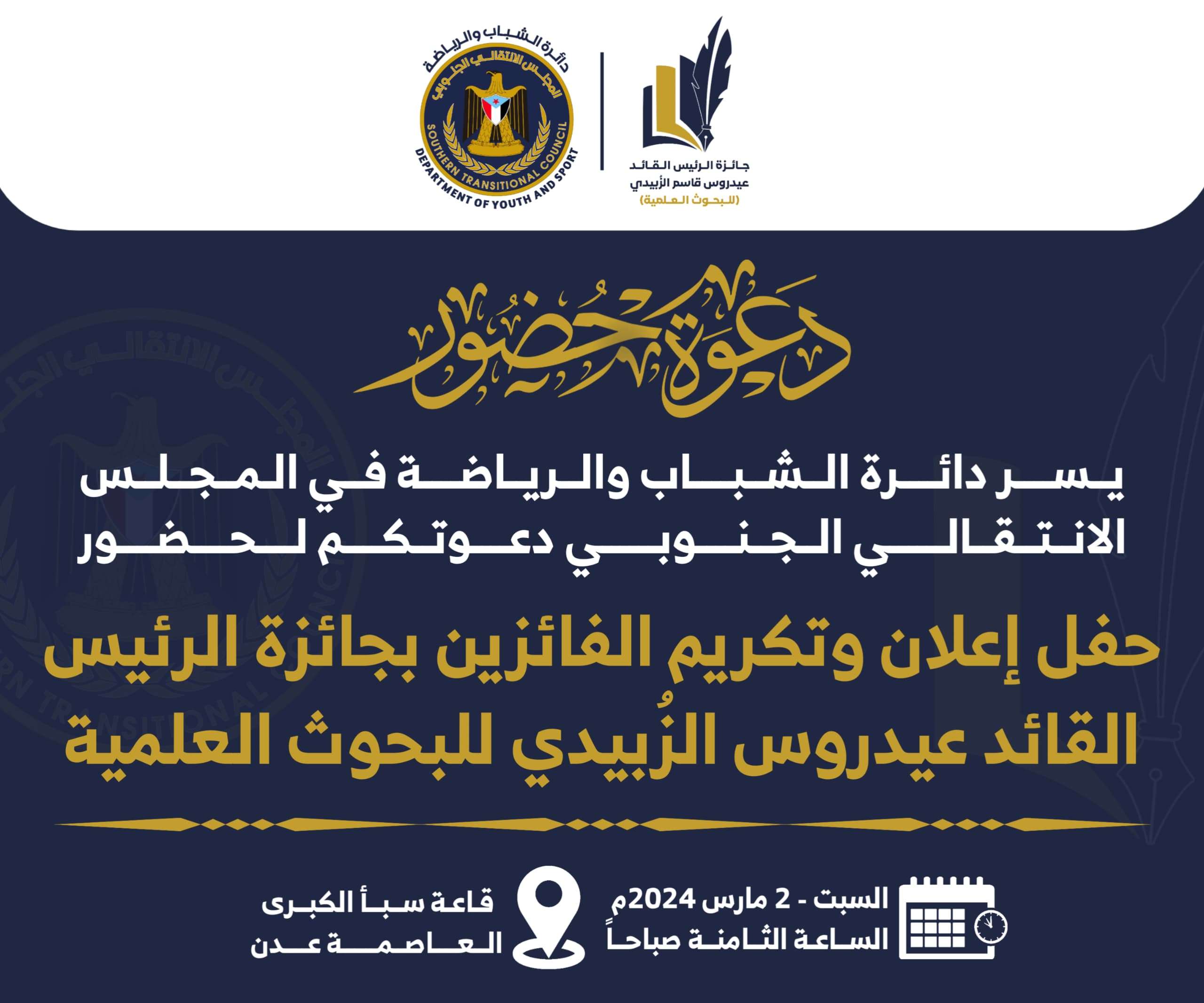 وستحتضن قاعة سبأ الكبرى، يوم غدٍ، الحفل الختامي والتكريمي لجائزة الرئيس الزُبيدي للبحوث العلمية في دورتها الأولى ، التي تنظمها دائرة الشباب والرياضة في المجلس الانتقالي الجنوبي، وتكريم الثلاثة المراكز الأولى من كل الفئات المشاركة (الاجتماعية والإنسانية، الطبية، الهندسية).