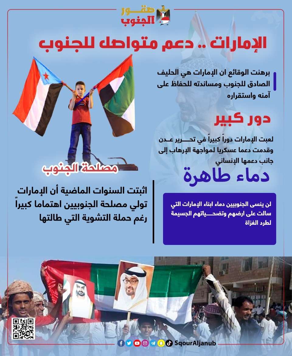 كما أكدوا على أن الجنوبيون بقيادة المجلس الانتقالي الجنوبي ممثل بالرئيس القائد عيدروس بن قاسم الزُبيدي، يحققون التنمية، ونوعية الحياة الأفضل بفضل الله، ودولة الإمارات، التي تنقل نموذج تطورها إلى شعب الجنوب.