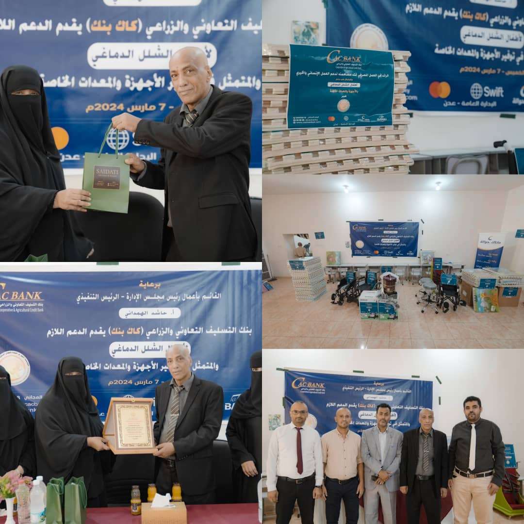 سلم بنك التسليف التعاوني والزراعي كاك بنك، المعدات والاجهزة الطبية التي سبق وان اعلن عنها في وقت سابق لدعم ومساعدة اطفال الشلل الدماغي والتي ترعاهم مؤسسة الحق في الحياة في العاصمة عدن، وذلك في اطار إيمانه بمسؤوليته الاجتماعية تجاه المجتمع وتفعيلاً لواجب التكافل والتعاون والتي تعتبر ركيزة أساسية لتوجهاته وثقافة البنك وبيئة التزامه.
