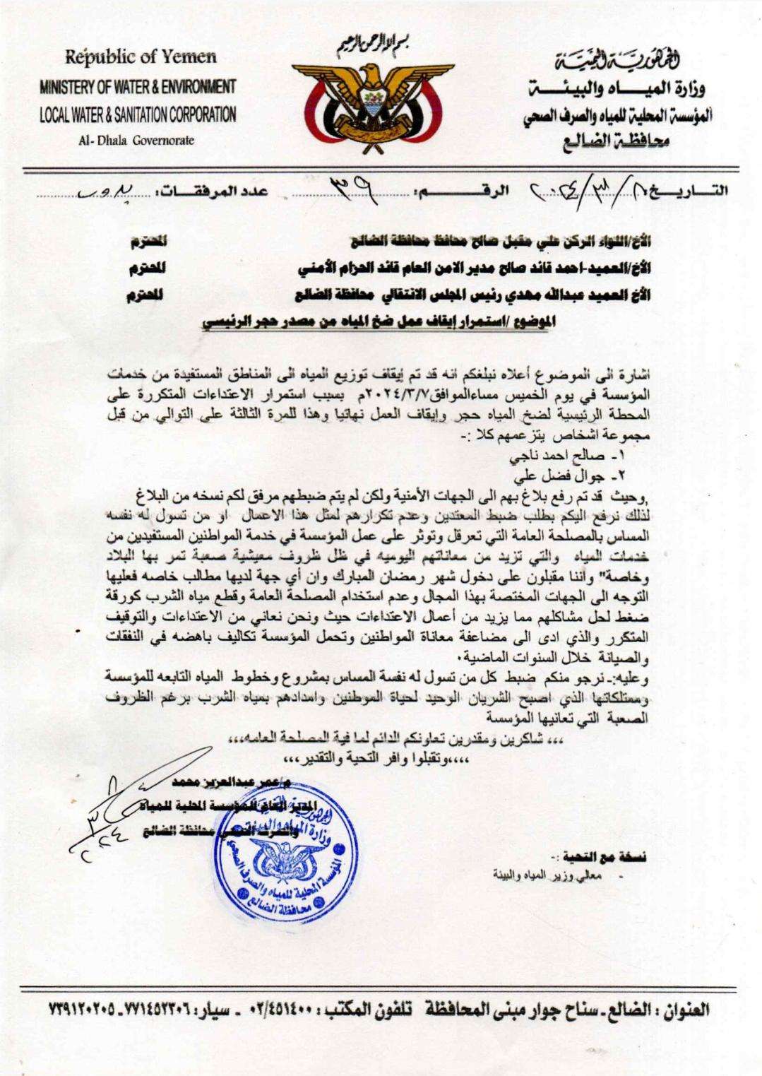 وجهت إدارة المؤسسة العامة للمياه بمحافظة الضالع بلاغاً إلى قيادة السلطة المحلية والمجلس الانتقالي والأجهزة الأمنية بالمحافظة وللرأي العام المحلي، أعلنت من خلاله توقف عملية ضخ المياه إلى المناطق المستفيدة، ابتداءً من يوم أمس الخميس الموافق السابع من مارس ٢٠٢٤م، بسبب ما وصفه البلاغ ب"الاعتداءات المتكررة على محطة الضخ الرئيسية بمنطقة حجر".