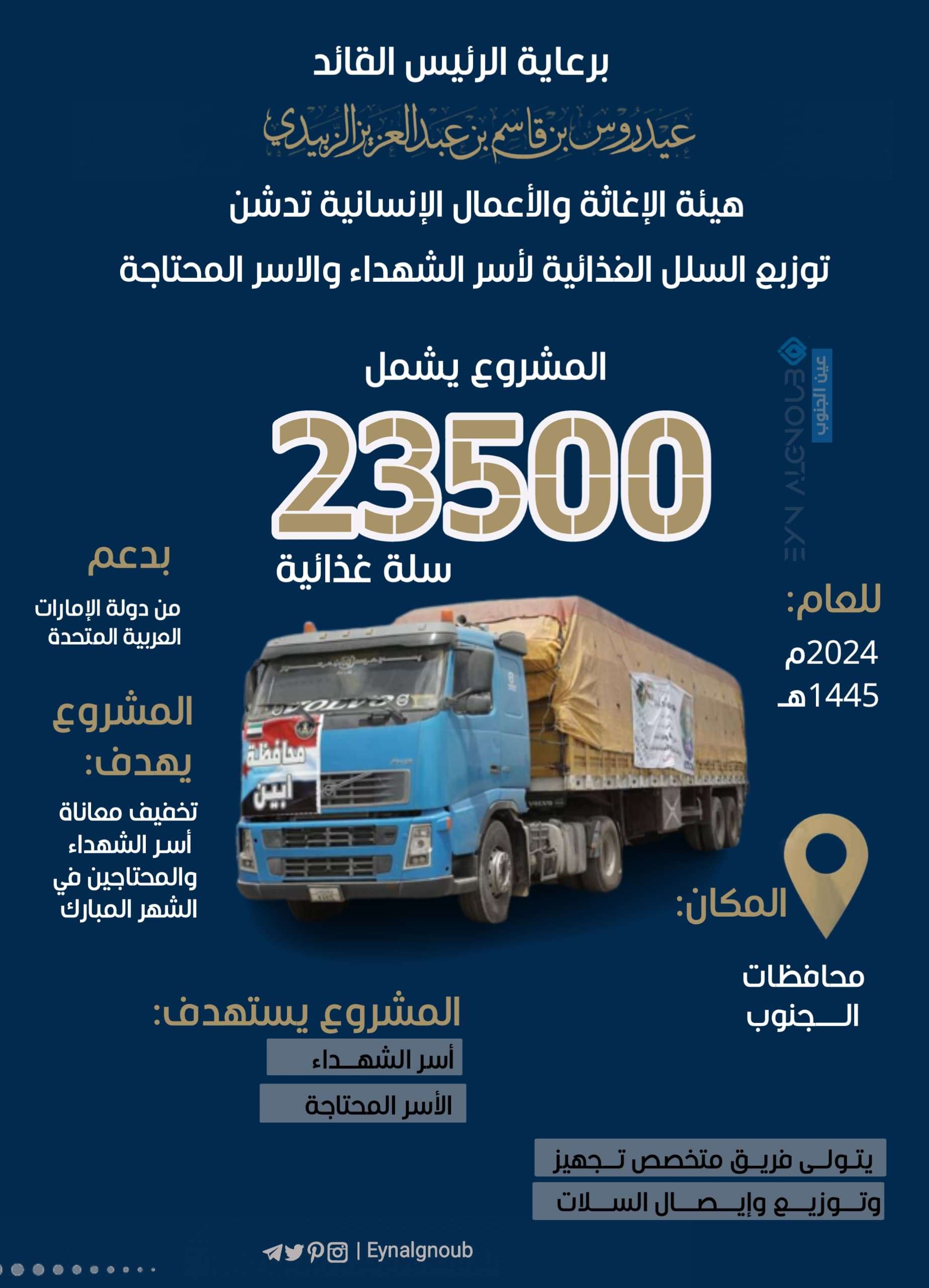 ويأتي اطلاق الهاشتاج بالتزامن مع بدء هيئة الإغاثة والأعمال الإنسانية المساعدة لهيئة رئاسة المجلس الانتقالي الجنوبي، تدشين مشروع توزيع السلال الغذائية على أسر الشهداء في كافة محافظات الجنوب.