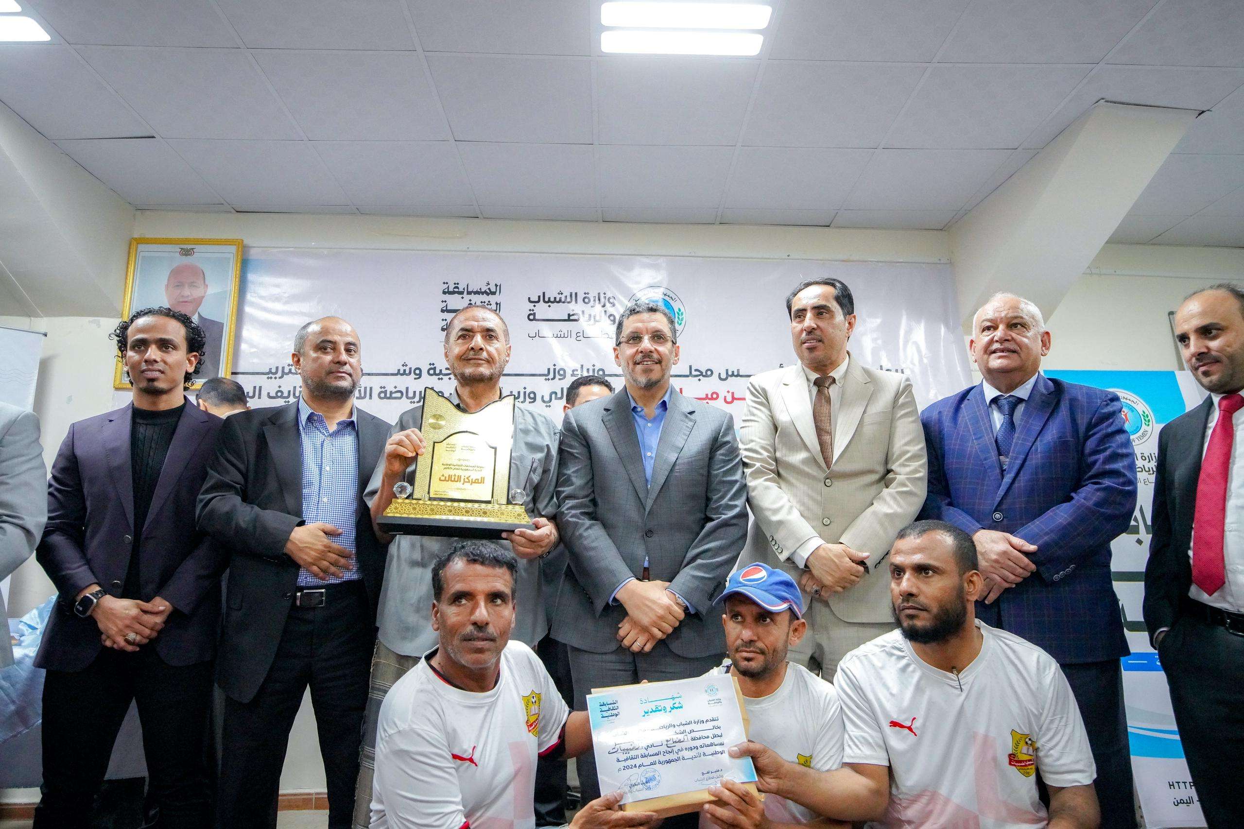 بحضور دولة رئيس الوزراء د. أحمد عوض بن مبارك، اختتمت وزارة الشباب والرياضة ممثلة بقطاع الشباب "المسابقة الثقافية الوطنية" للأندية في المحافظات المحررة، التي، أُقيمت برعايته، وإشراف معالي وزير الشباب والرياضة البكري، بدعم من صندوق رعاية النشء والشباب، وتوّج بها نادي شباب القطن من وادي حضرموت.