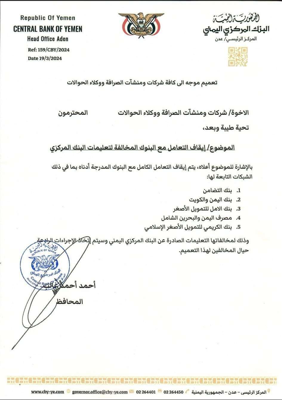 وأشار الى ان المحافظ المعبقي وجه تعميما باسمه وصفته وتوقيعه وختم البنك المركزي إلى كافة شركات ومنشآت الصرافة ووكلاء الحوالات بإيقاف التعامل (الكامل) مع البنوك المخالفة لتعليمات البنك المركزي عدن وهي: