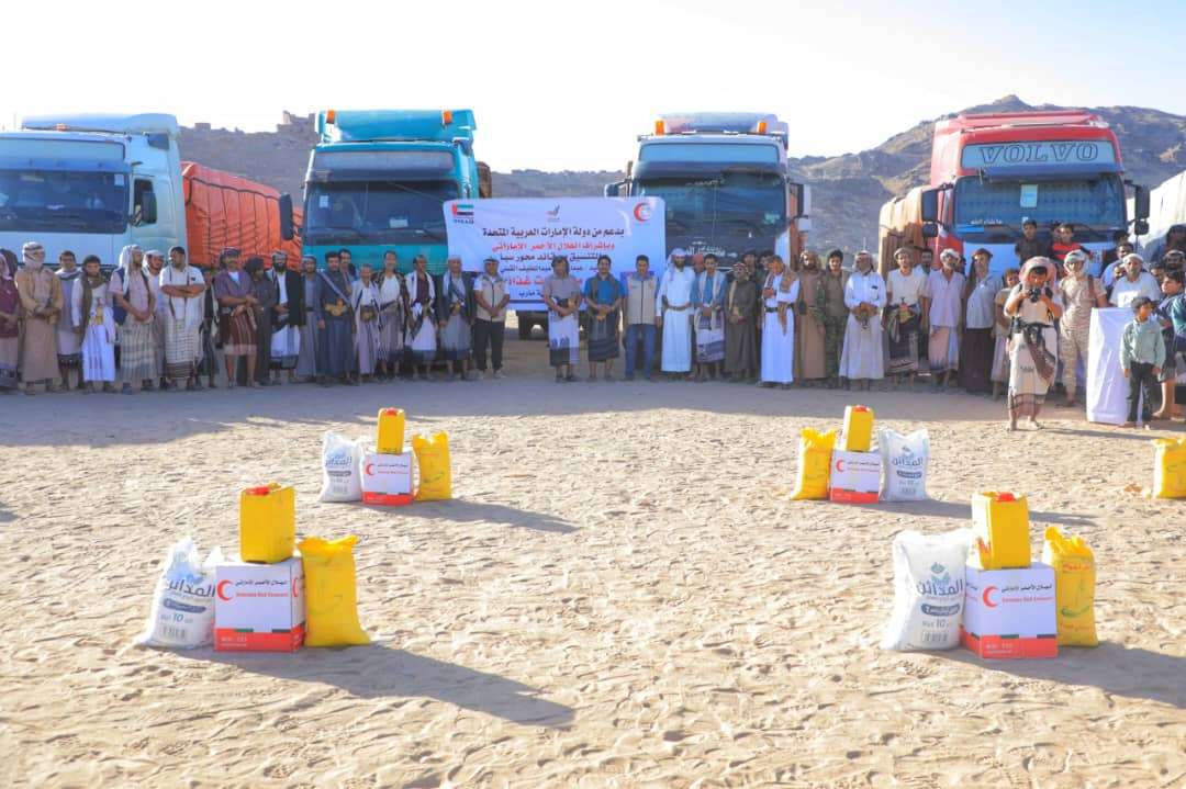 الهلال الأحمر الإماراتي يوزع مساعدات غذائية لأهالي مديرية حريب بمأرب