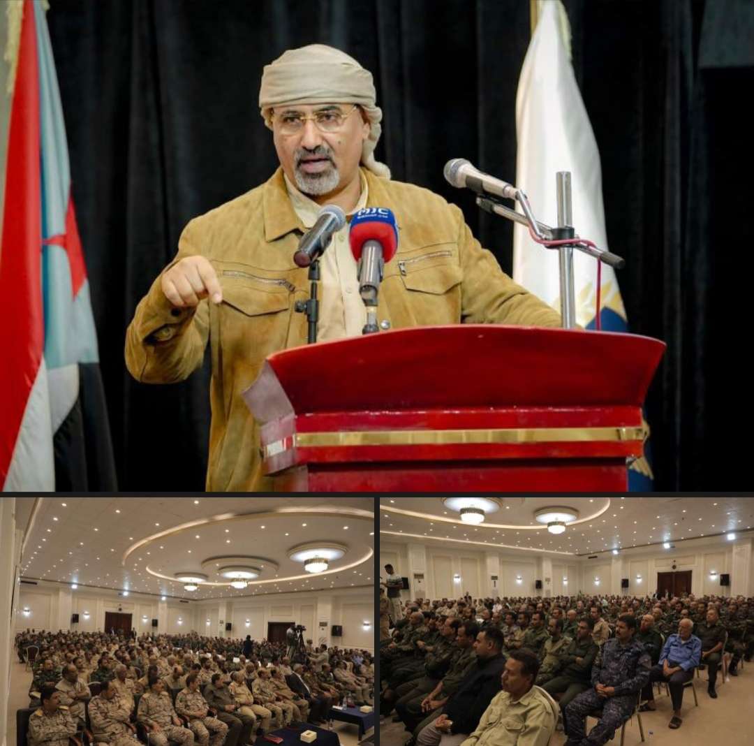 وفي كلمة توجيهية للحاضرين من رؤوساء الهيئات، ومديري الدوائر العسكرية والأمنية، ومحافظي المحافظات، وقادة المحاور والوحدات الدفاعية والأمنية، قال الرئيس الزُبيدي :"إن هذا اللقاء الموسع يكتسب أهميته من عظمة الدور والمهام التي تضطلع بها قواتنا المسلحة والأمن، وما تحمله من رسالة تاريخية ووطنية على عاتقها في تأمين حاضر ومستقبل الجنوب والذود عن أراضيه وحماية أمنه واستقراره، وكذلك لأهمية ما تحمله المرحلة الراهنة من تحديّات".