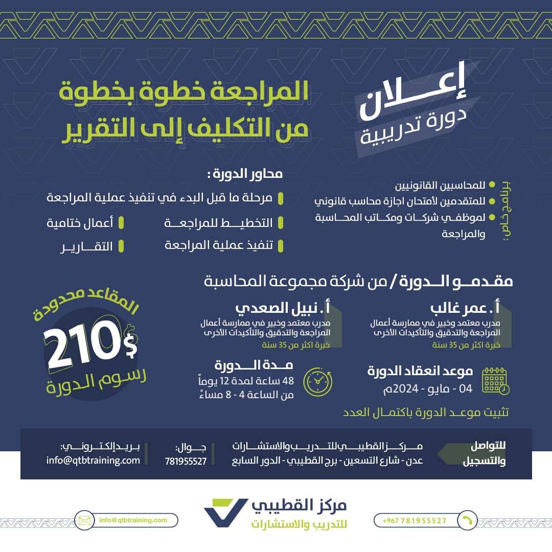 أعلن مركز القطيبي للتدريب والاستشارات عن إقامة دورة تدريبية بعنوان: (المراجعة خطوة بخطوة من التكليف إلى التقرير)