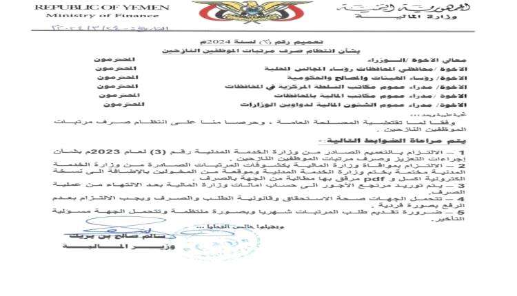 أصدر وزير المالية في الحكومة الشرعية يوم أمس الأحد الموافق 24مارس2024م تعميما جديدا يتعلق بصرف مرتبات الموظفين النازحين والمناطق المحررة موجه إلى الوزراء ومحافظي المحافظات ورؤساء الهيئات والمصالح الحكومية ويتكون من خمسة بنود تعزز سلطات ومركزية وزارة الخدمة المدنية في مخالفة واضحة للقوانين واللوائح المنظمة لعمل الوزارات والهيئات الحكومية والسلطات المحلية ومصادرة لصلاحياتها فيما يتعلق بصرف المرتبات .