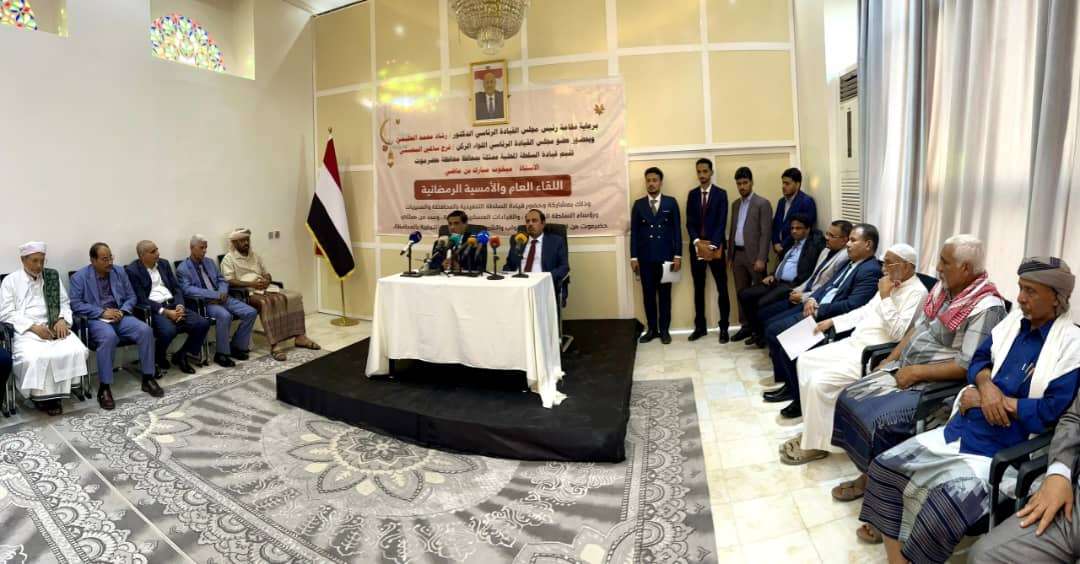 جاء ذلك في اللقاء العام والأمسية الرمضانية، التي أقامتها السلطة المحلية بمحافظة حضرموت، بحضور المحافظ مبخوت مبارك بن ماضي، والأمين العام للمجلس المحلي صالح العمقي، وأعضاء مجلسي النواب والشورى، ووكلاء محافظة حضرموت، وقيادة السلطة التنفيذية بالمحافظة والمديريات، ورؤساء السلطة القضائية، والقيادات العسكرية والأمنية، وأعضاء الغرفة التجارية.