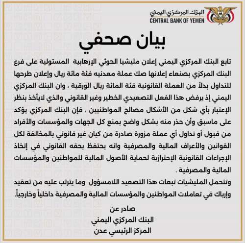 جدد البنك المركزي اليمني في العاصمة المؤقتة عدن، تحذيره لكل الجهات والمؤسسات والأفراد من تداول أي عملة صادرة من فرع البنك في صنعاء المستولى عليه من قبل ميليشيا الحوثي الإرهابية.