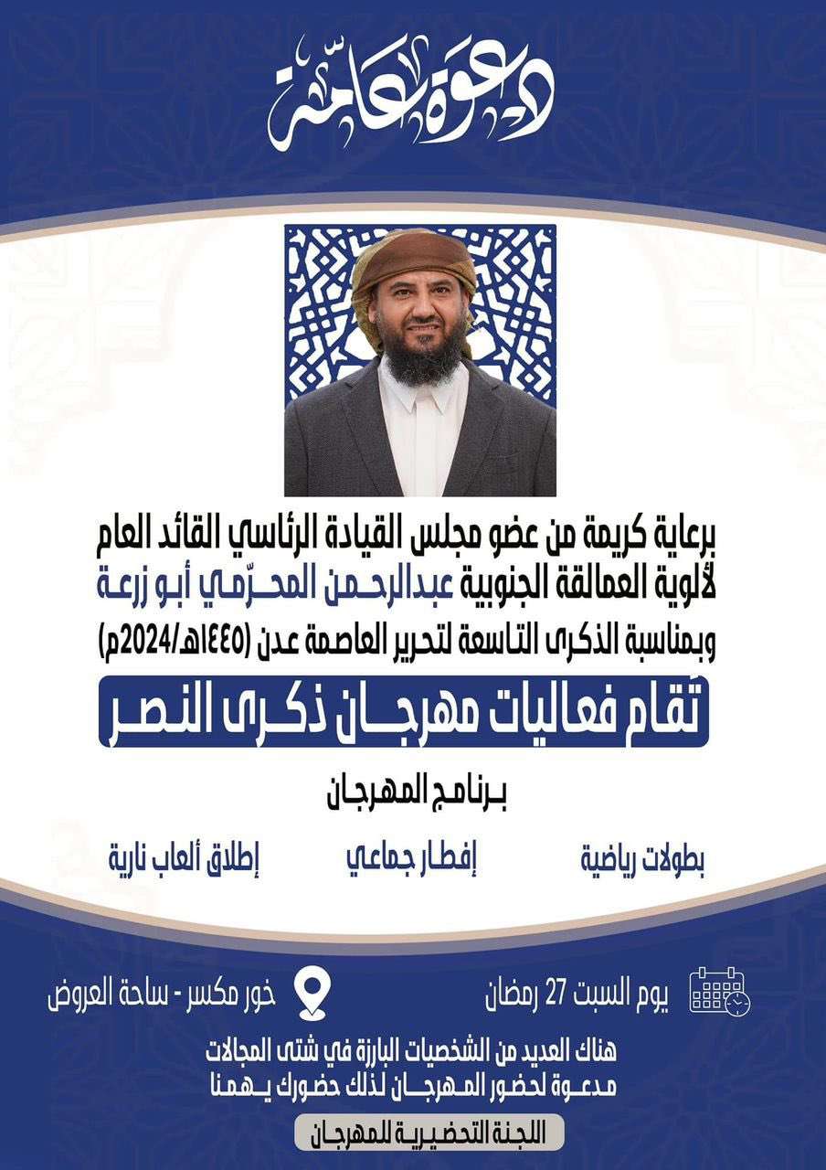 دعت اللجنة التحضيرية لمهرجان ذكرى النصر، جميع أبناء العاصمة عدن، لحضور الإفطار الجماعي، المقرر انعقاده يوم السبت المقبل "27 رمضان"، في ساحة العروض بمديرية خورمكسر، برعاية كريمة من عضو مجلس القيادة الرئاسي نائب رئيس المجلس الانتقالي الجنوبي القائد العام لألوية العمالقة الجنوبية عبدالرحمن المحرمي "أبو زرعة".