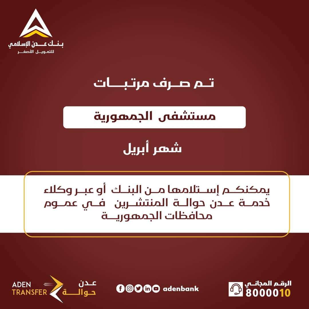 بدء صرف مرتبات موظفي مستشفى الجمهورية بعدن لشهر أبريل عبر بنك عدن الإسلامي للتمويل الأصغر