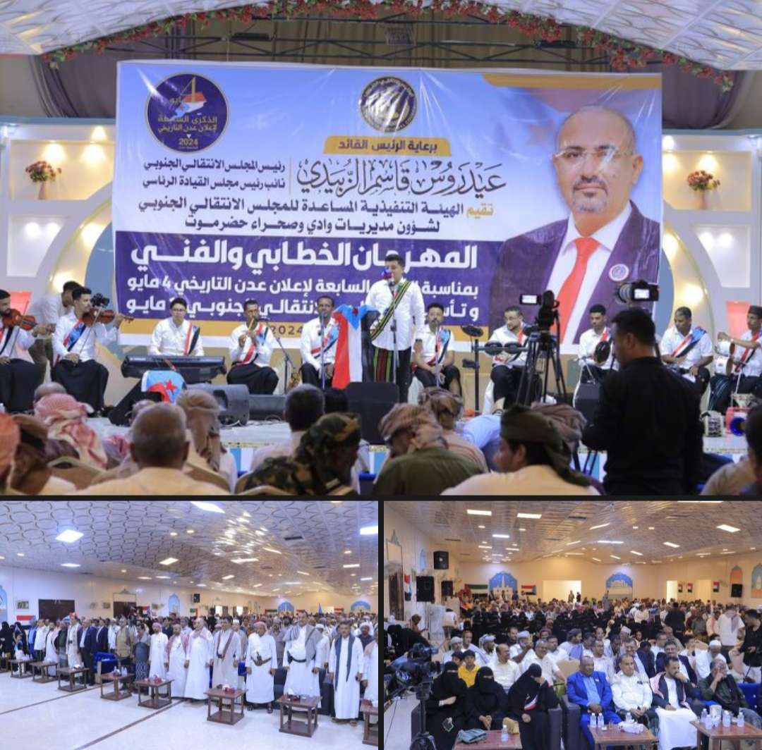 نظمت الهيئة التنفيذية المساعدة للمجلس الانتقالي الجنوبي لشؤون مديريات وادي وصحراء حضرموت، اليوم السبت، بمدينة سيئون حفلاً خطابياً وفنياً بمناسبة الذكرى السابعة لإعلان عدن التاريخي وذكرى تأسيس المجلس الانتقالي الجنوبي.