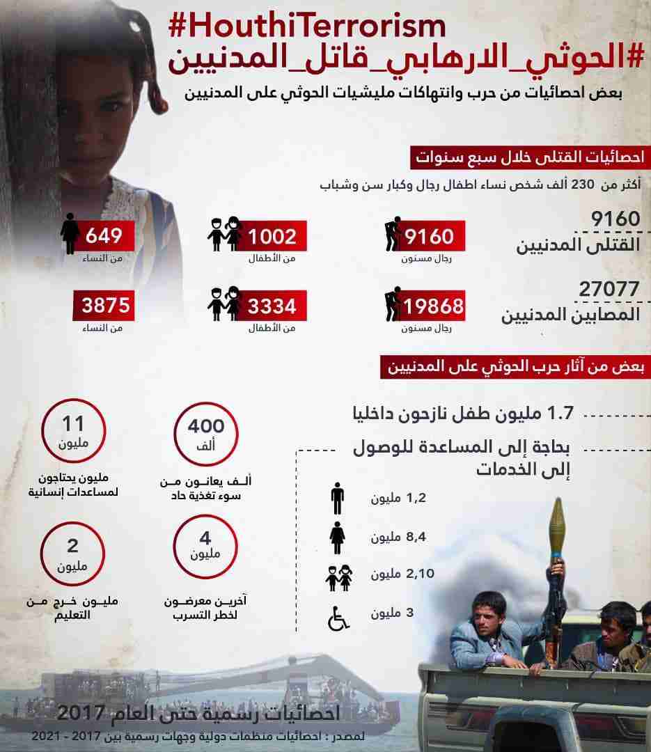 تواصل مليشيات الحوثي المدعومة من إيران الحرب على الشعب اليمني منذ سبع سنوات وتتعدد جرائم المليشيات بين جرائم مباشرة تتمثل في الاستهداف العشوائي وغير مباشر من خلال الحصار ومنع المساعدات وزراعة الألغام .