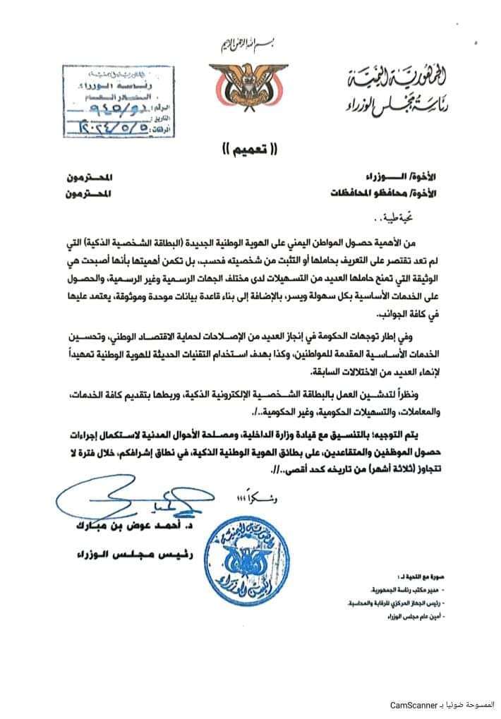 وجّه رئيس مجلس الوزراء اليمني، الدكتور أحمد عوض بن مبارك، تعميماً إلى كافة الوزراء والمحافظين، بإلزام الموظفين والمتقاعدين بالحصول على البطاقة الشخصية الذكية خلال مدة أقصاها ثلاثة أشهر من تاريخ التعميم..