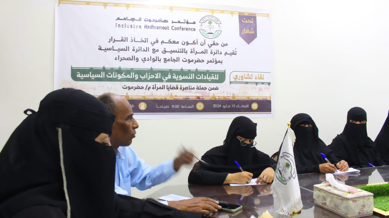 عقد يوم أمس الاربعاء 15 مايو 2024م، بمقر مؤتمر حضرموت الجامع بسيئون لقاء تشاوري للقيادات النسوية في الاحزاب والمكونات السياسية بوادي حضرموت تحت شعار ( من حقي اكون معكم في اتخاذ القرار)، نظمته دائرة المراة بمؤتمر حضرموت الجامع بالوادي والصحراء، بالتنسيق مع الدائرة السياسية وفريق مناصرة قضايا المراة بحضرموت.