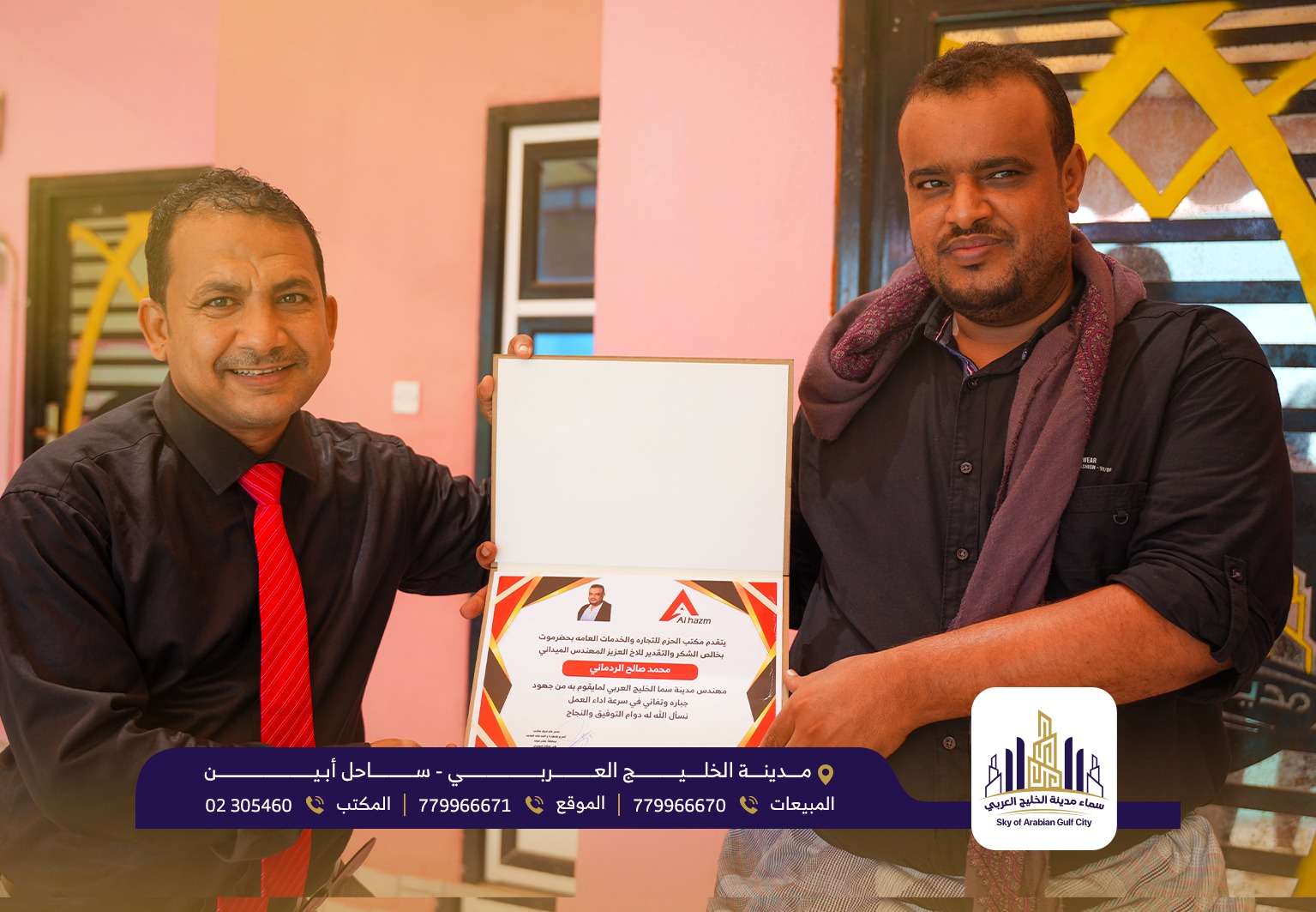 يتقدم مكتب الحزم للتجارة والخدمات العامة محافظة حضرموت للاخ العزيز المهندس الميداني محمد صالح الردماني مهندس مدينة الخليج العربي لما يقوم به من جهود جبارة وتفاني في أداء سرعة العمل نسأل الله له دوام التوفيق والنجاح